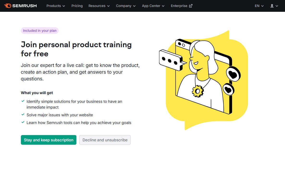- widzi propozycje alternatywne, np. darmowe szkolenie czy inne funkcje, z wyraźnymi przyciskami zachęcającymi do pozostania,