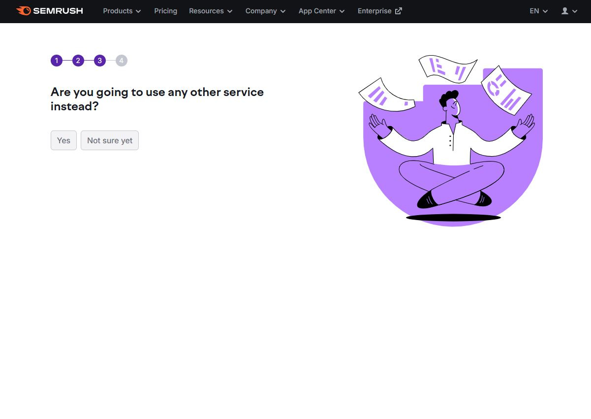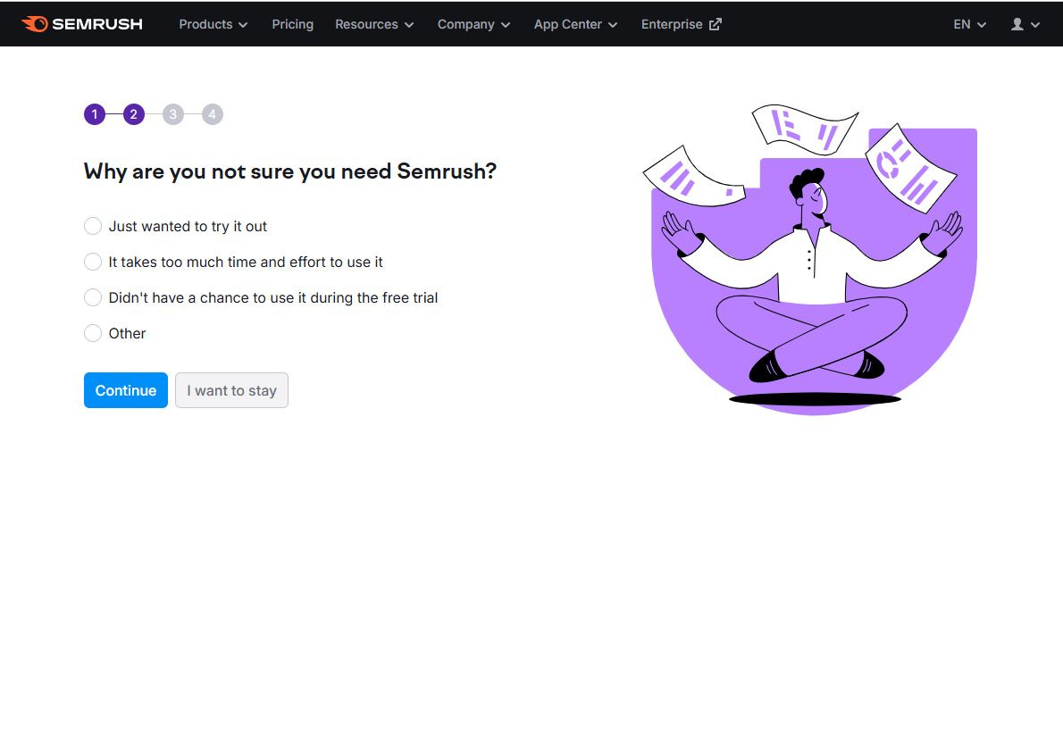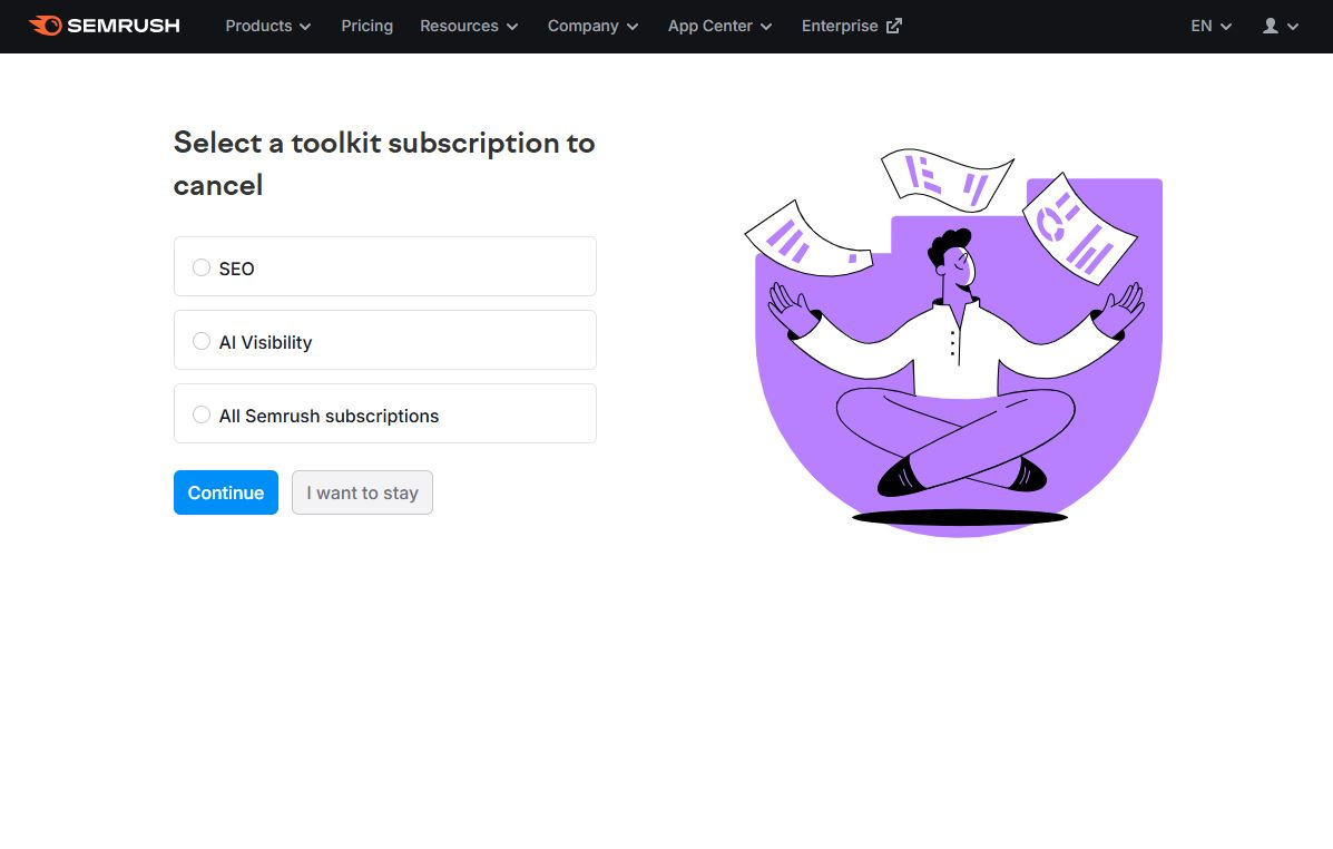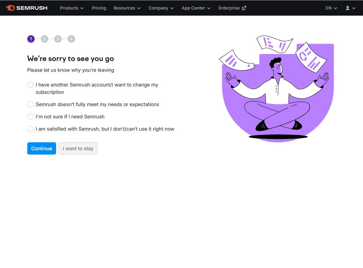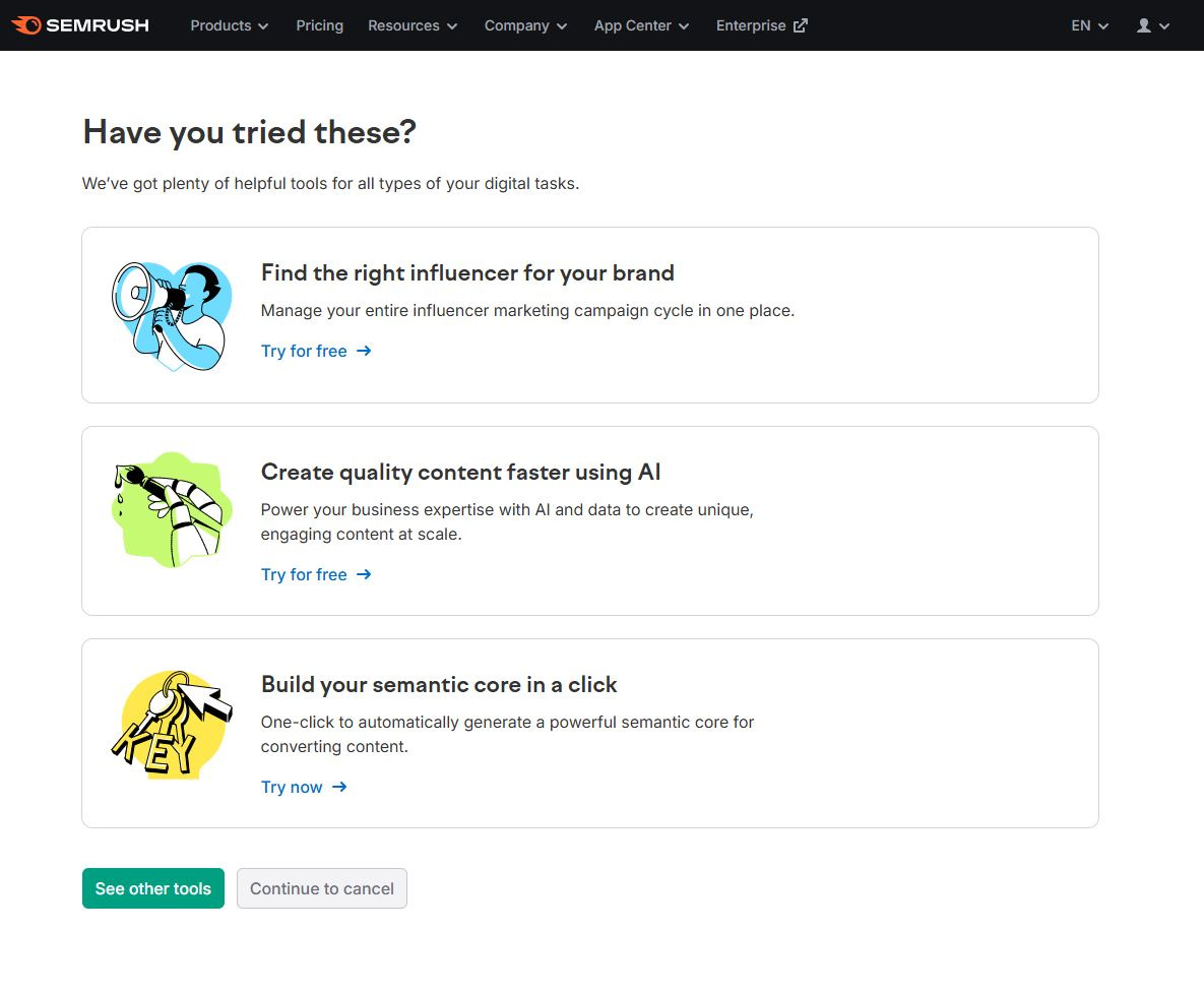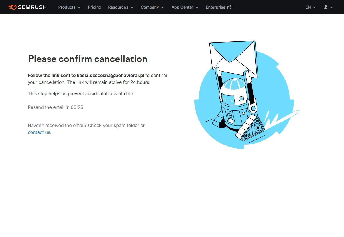 W moim przypadku była to próba anulowania Semrush. Wejście do produktu było szybkie i bezproblemowe: podpięcie karty, dostęp do narzędzia, wszystko jasne. Moment wyjścia wyglądał zupełnie inaczej i to doświadczenie bardzo dobrze pokazuje, czym w praktyce jest tzw. Hotel California Effect.