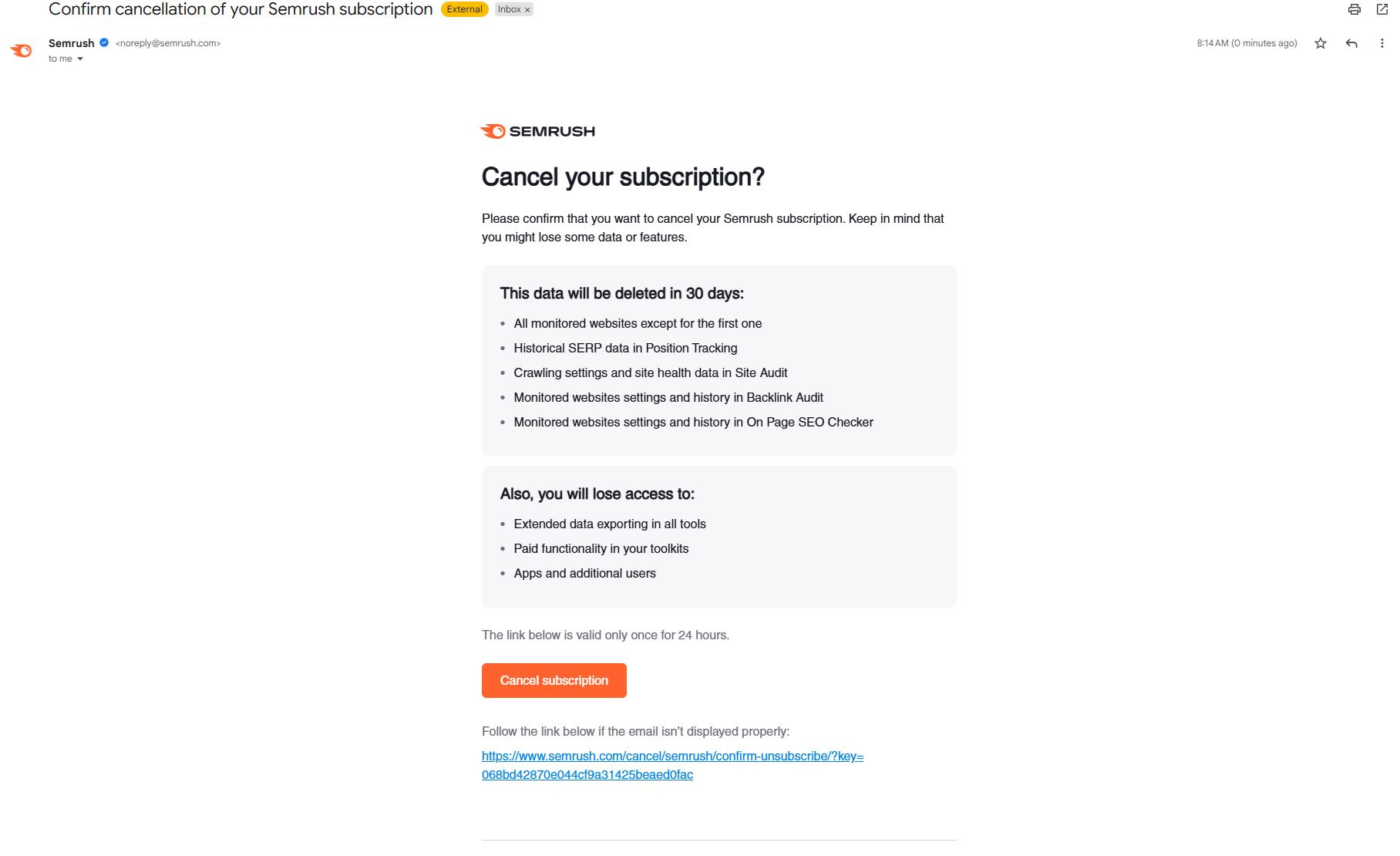 Dopiero na samym końcu pojawia się mail z linkiem potwierdzającym anulowanie subskrypcji.