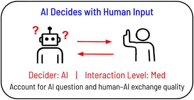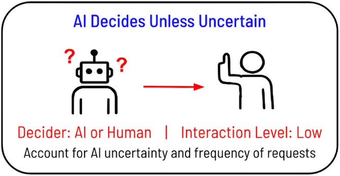W trzecim trybie współpracy AI nie działa ani w pełni autonomicznie, ani wyłącznie jako pasywny doradca. Zamiast tego aktywnie rozpoznaje momenty niepewności i w tych momentach angażuje człowieka, prosząc o dodatkowe informacje, decyzje lub doprecyzowanie kontekstu.